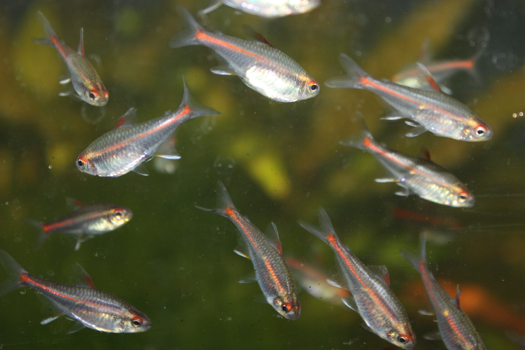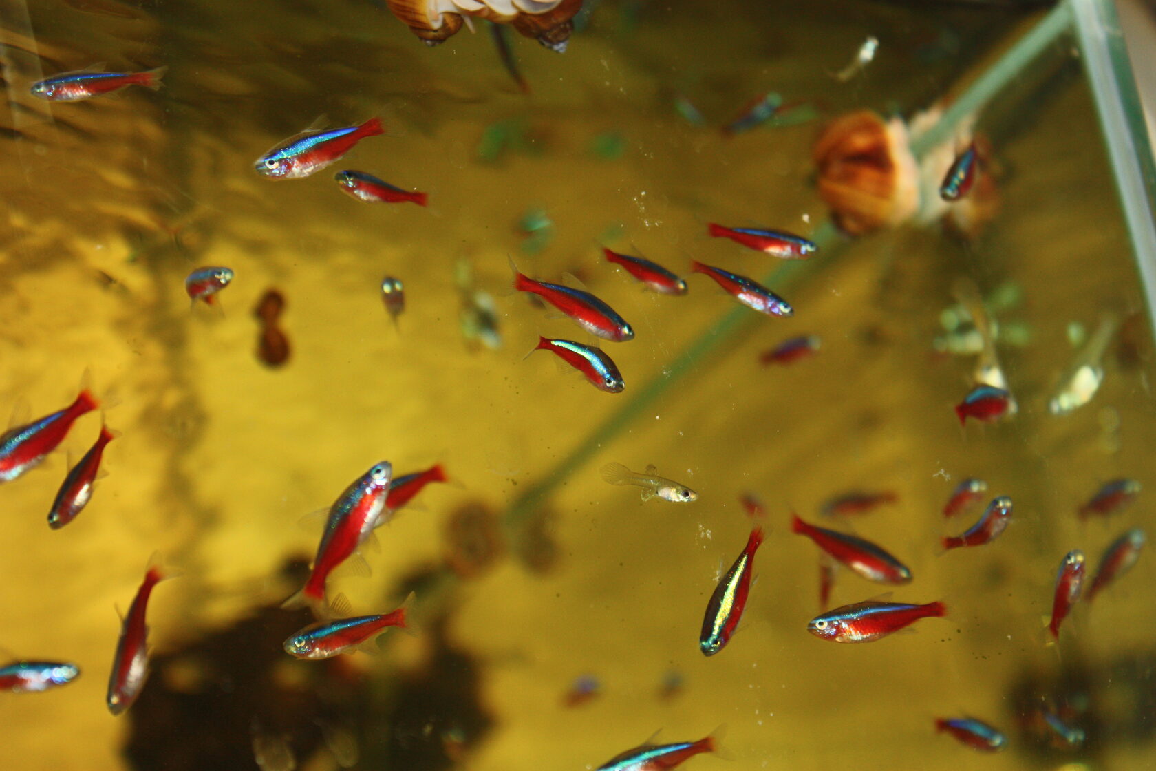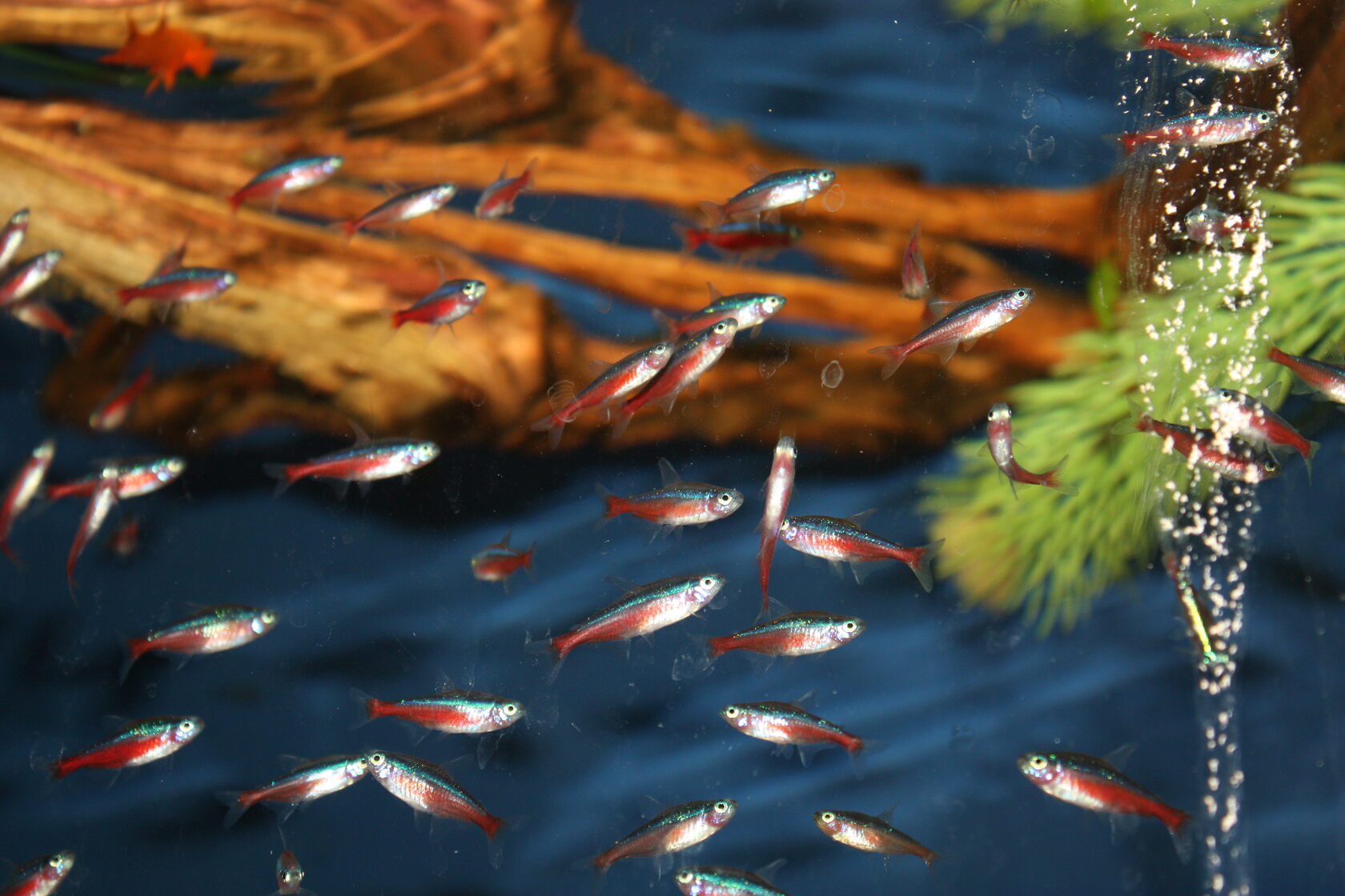Красный неон (или Кардинальская тетра) — одна из самых популярных и красивых аквариумных рыбок, отличающаяся невероятно яркой окраской. Он очень похож на обыкновенного (голубого) неона, но его красная полоса проходит по всему телу, а не только до середины. Ареал обитания: Южная Америка (бассейны рек Ориноко и Риу-Негру, так называемая зона "черной воды"). В аквариуме вырастает до 4,5–5 см. Яркая, неоново-голубая полоса проходит от глаза до жирового плавника, а широкая, ярко-красная полоса тянется через всю нижнюю часть тела, от головы до хвоста. Мирная, стайная и очень активная рыбка. Красный неон — рыбка, которая, хоть и является выносливой при стабильных условиях, более требовательна к параметрам воды, чем обыкновенный неон, поскольку в природе обитает в мягкой и кислой "черной воде". Температура воды: 22-28°C. pH: 6.0-7.5. Жесткость воды: Средняя жесткость. Объем аквариума: Минимум 50 литров для небольшой группы рыб. Фильтрация и аэрация: Необходимы для поддержания чистоты воды и насыщения её кислородом. Обязательно содержать стайкой, минимум 6-7 особей, а лучше 10−15. В стае рыбки выглядят более эффектно, меньше стрессуют и не проявляют агрессии. От 50-60 литров для стайки (6−10 особей и более) Красный неон — идеальная рыба для общего аквариума с мирными соседями: Отличные соседи: другие виды неонов (голубой, черный), тетры (родостомусы, фонарики, лимонные), расборы, мирные сомики (коридорасы, анциструсы), мелкие карликовые цихлиды (апистограммы).