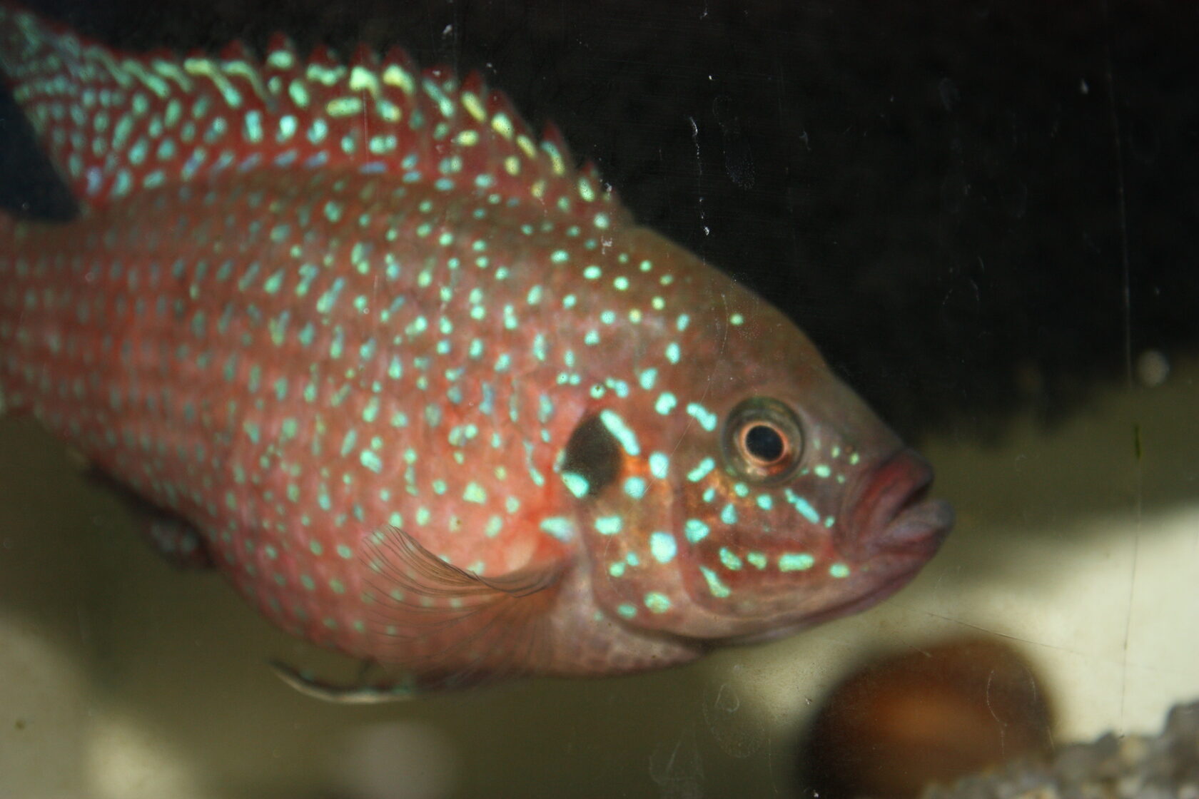 Хромис-красавец (Hemichromis bimaculatus) — пресноводная рыба семейства цихлид, родом из Западной Африки. Она известна своей яркой окраской и активным поведением, благодаря чему пользуется популярностью среди аквариумистов. Достигает длины около 8-12 см. Ярко-красное тело с металлическими оттенками, часто с двумя черными пятнами вдоль тела.Продолжительность жизни от 3 до 5 лет при правильном уходе. Температура воды: 23-28°C. pH уровня: 6.0-7.5. 100 литров для пары рыб. Хромисы-красавцы всеядны и охотно принимают сухие корма, замороженных артемий, мотыль и мелких насекомых. Эти рыбы территориальны и агрессивны, особенно в период нереста. Лучше всего содержать их отдельно или с крупными видами, способными постоять за себя.