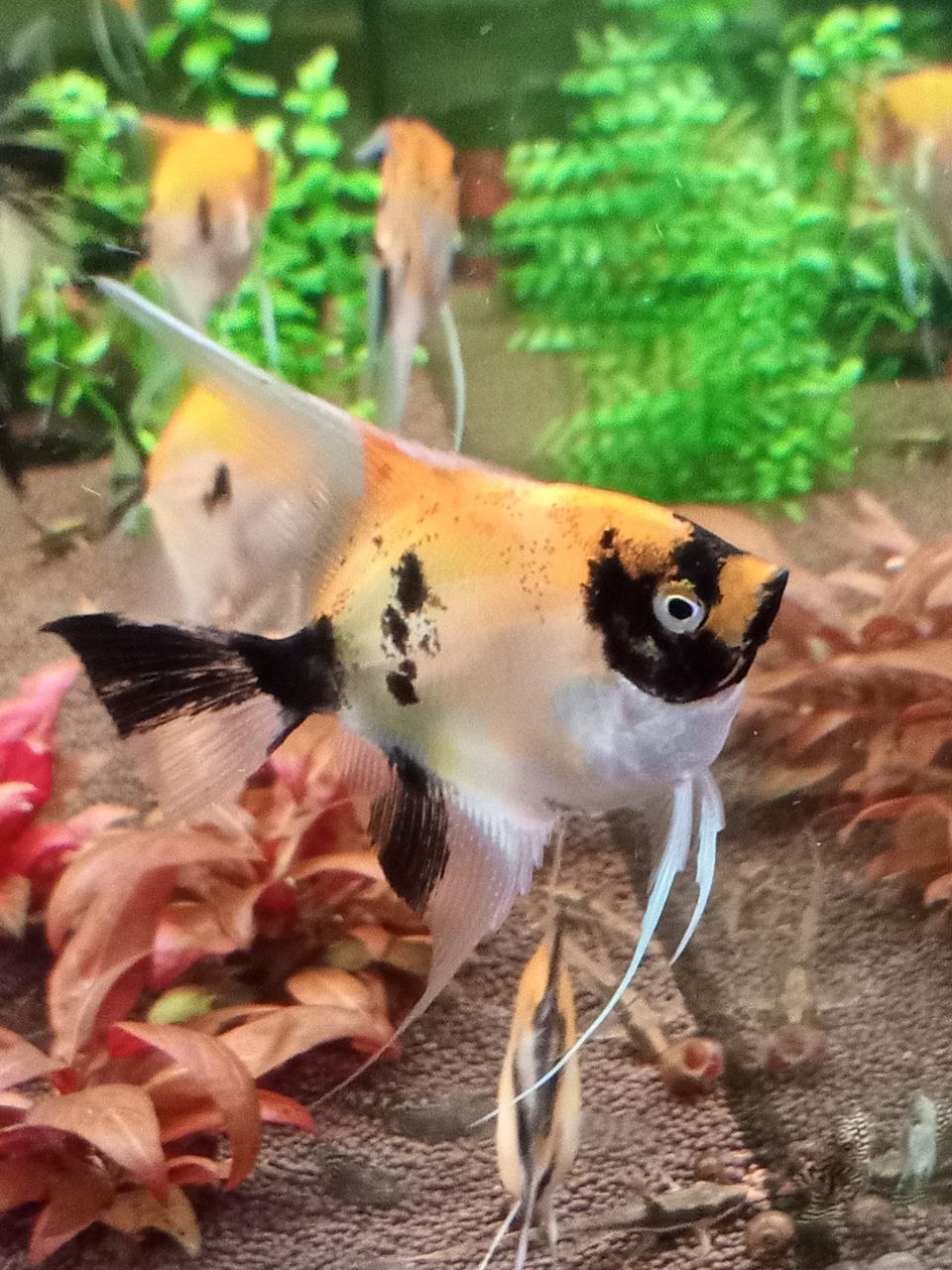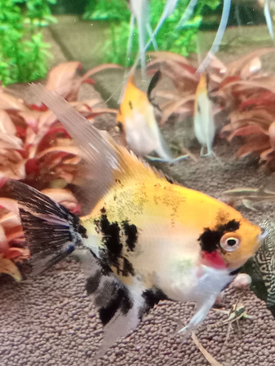 Эта рыбка получила свое название за характерный трехцветный окрас, напоминающий японских карпов Кои. Селекционная (искусственно выведенная) форма обыкновенной скалярии (Pterophyllum scalare). Окрас: Отличительная особенность — трехцветный или двухцветный узор: Основной фон тела: белый или золотистый (желтый). Хаотично разбросанные черные и яркие красно-оранжевые/желтые пятна. Лоб и спинка: Часто окрашены в ярко-оранжевый или красный цвет. Окрас сильно зависит от генетики, условий содержания и, в особенности, корма. Интенсивность оранжевого цвета может меняться и даже уменьшаться с возрастом. Как у всех скалярий – высокое, сильно сжатое с боков, напоминающее полумесяц. Спинной и анальный плавники удлинены, брюшные плавники вытянуты в нити. Достигают 12-17 см в длину и до 20-30 см в высоту (с учетом плавников). Объем аквариума от 100 литров на пару, от 200 литров для группыю Нужен высокий аквариум (желательно от 50 см). Температура (T) 24−28∘C Теплолюбивые рыбы. Кислотность (pH) 6,5−7,5 Нейтральная или слабокислая. Жесткость (GH) 5−15∘dGH Предпочитают мягкую или средней жесткости воду. Еженедельная подмена 20−30% воды, хорошая фильтрация и аэрация. Скалярии чувствительны к чистоте воды.
