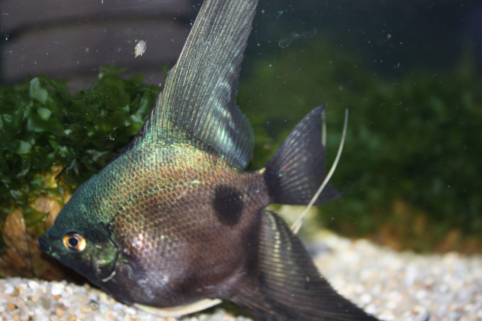 Внешний вид: - Цвет: Глубокий черный оттенок, иногда с металлическим блеском. - Форма тела: Высокое и сжатое с боков тело, длинные спинной и анальный плавники образуют полукруглую форму. - Размер: Взрослые особи достигают длины около 15 см и высоты до 25 см.