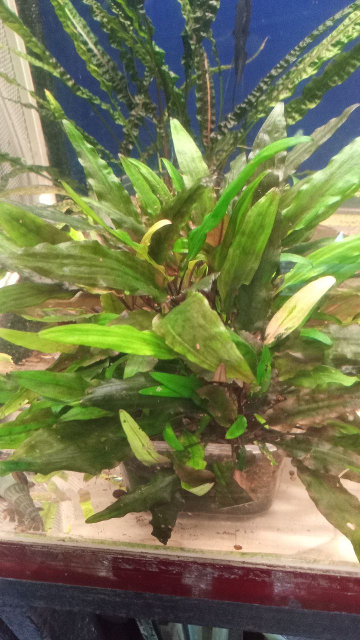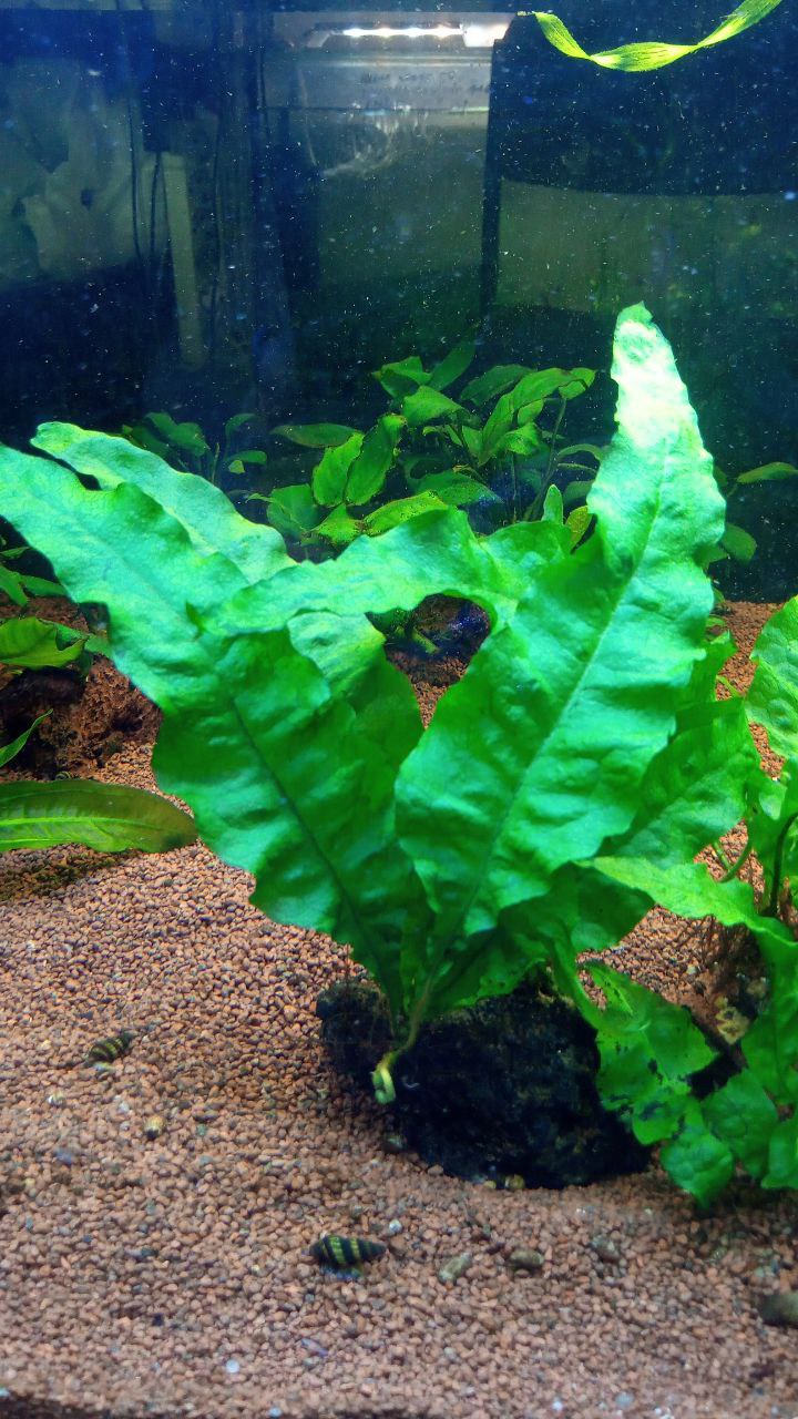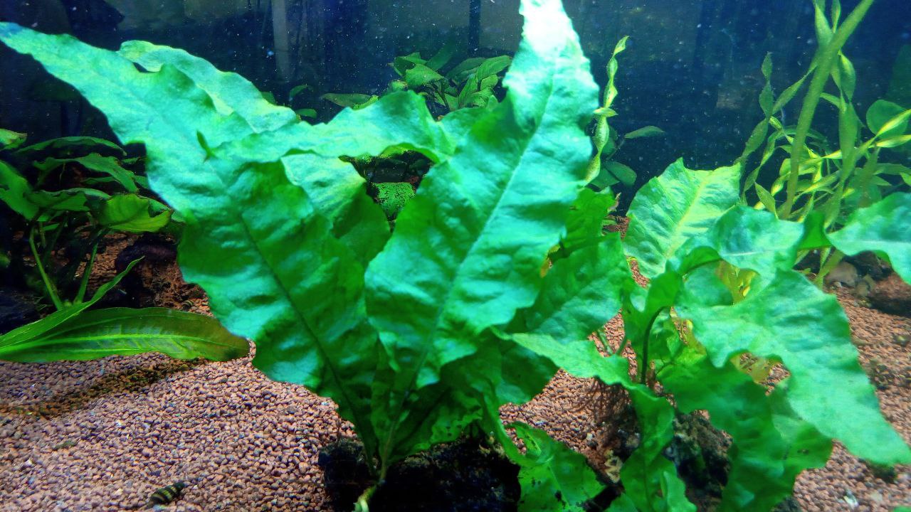 Таиландский широколистный папоротник является разновидностью популярного аквариумного растения Microsorum pteropus, широко известного как водный папоротник. Это растение отличается крупными листьями шириной около 8 см и длиной примерно 15 см, обладающими волнистым краем и темно-зеленым цветом. Листья имеют характерную форму и структуру, благодаря чему растение выглядит привлекательно и добавляет декоративности любому аквариумному ландшафту. Растение способно прикрепляться корнями к различным поверхностям, таким как камни, коряги или грунт, что позволяет легко интегрировать его в оформление аквариума. Широколистный вариант папоротника хорошо адаптируется к разным условиям содержания, однако предпочитает мягкую воду и умеренное освещение. Для оптимального роста рекомендуется обеспечить достаточное количество питательных веществ, особенно железа, которое способствует насыщенному зеленому цвету листьев. Регулярная обрезка старых и поврежденных листьев помогает поддерживать здоровье растения и улучшает общий вид аквариума. Температура воды должна поддерживаться в пределах 22-28°C. Широколистный тайландский папоротник часто используется в оформлении голландских и природных аквариумов, где он создает эффектные композиции вместе с другими растениями и элементами декора. Его крупные листья служат укрытием для рыб и креветок, а также помогают стабилизировать биологическое равновесие в аквариуме.