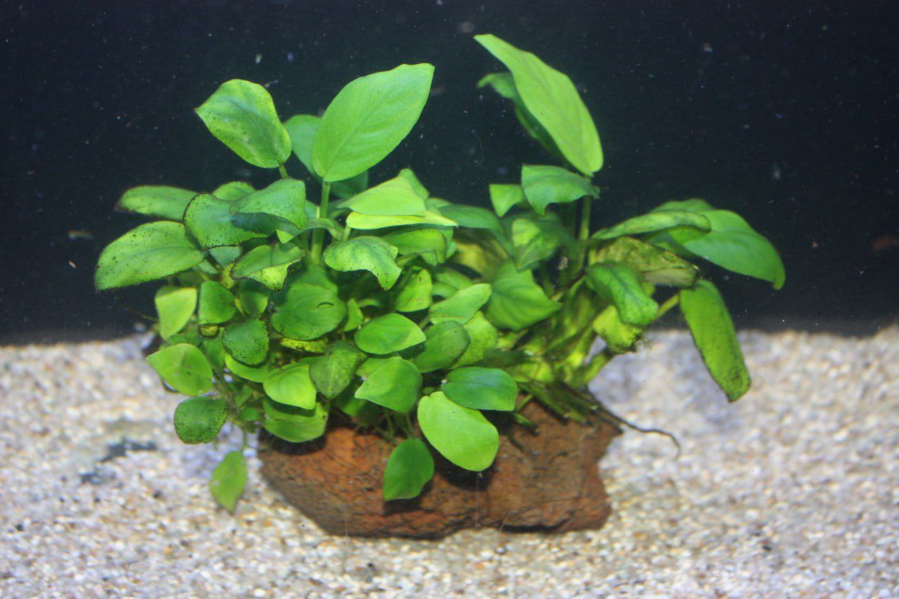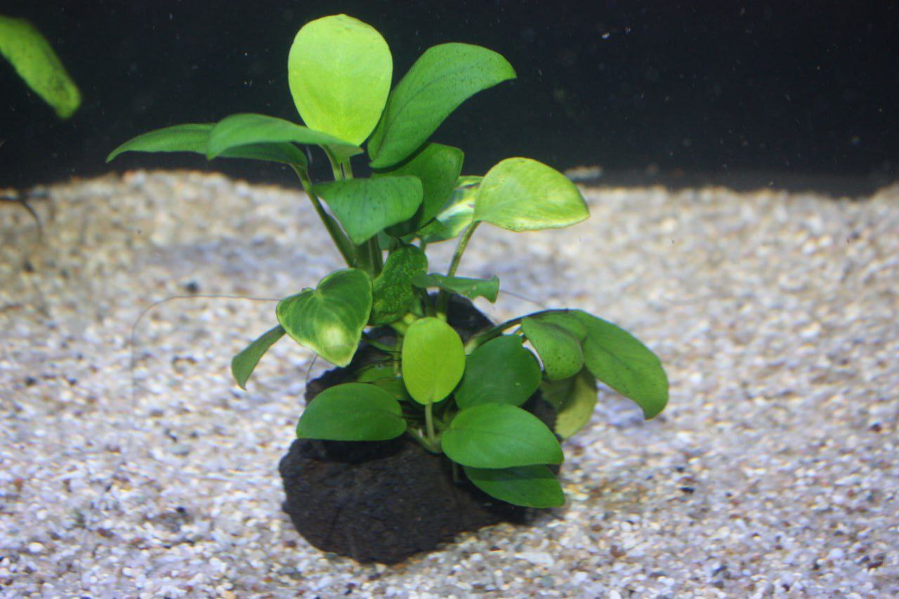 Анубиас Бартера (Anubias barteri) — это выносливое аквариумное растение, принадлежащее к семейству Ароидных (Araceae). Анубиас ценится аквариумистами за свою неприхотливость и привлекательность, а также способность расти практически в любых условиях. Высота взрослого растения варьируется от 15 до 30 см, в зависимости от подвида. Толстые, жесткие, сердцевидной формы, темно-зеленого цвета. Мощные, крепкие корни позволяют прочно удерживаться на камнях и корягах. Анубиас нана часто используют для декорирования переднего и среднего планов аквариума, придавая композициям естественный и привлекательный вид. Его компактные размеры делают его идеальным выбором для небольших объемов.